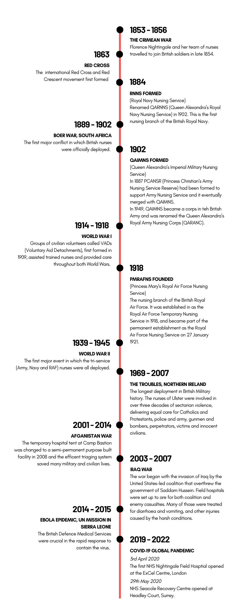 Here we outline a brief history of British Military Nursing from Nightingale and Seacole through to today. While we highlight a few conflicts within this timeline to show the changes that have occurred, we are aware that there are many others that have also helped with the development of medical care within the Armed Services.