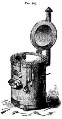 His field stove solved many problems. The design was an iron cylinder, with a hinged, tightly-fitting lid and a fire at the bottom. The enclosed fire greatly improved fuel efficiency, and could use wood, coal, or other locally available fuel. Soyer calculated that it would save an army of 40,000 men 90 tons of fuel per day [17], a massive saving of around 90% [18]. A door opened low down at the front of the stove to allow fuel to be added, and a valve could be adjusted to control air intake to regulate the rate of cooking, dramatically improving the quality of the food. Smoke was vented by a capped chimney at the back. It produced so much less smoke than open fires that it could be used inside tents, also providing welcome warmth, and was much less visible to the enemy. The lid prevented loss of heat and steam. As the fire was protected from the weather, it allowed food to be cooked outside, even in the rain [19].