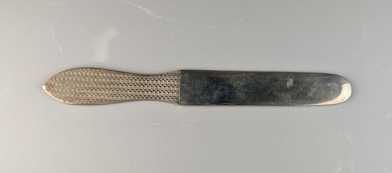 About this objectA steel tongue depressor. Groves on one end could be for grip or to also work as a file.