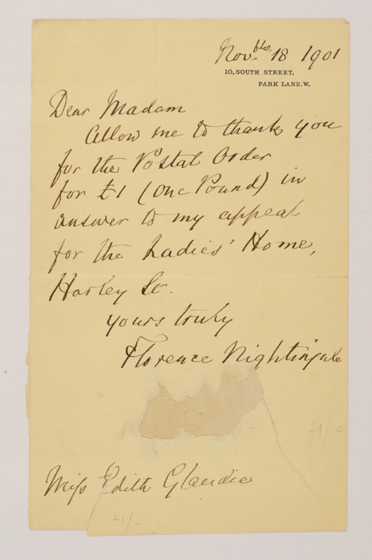 About this objectLetter, 18 November 1901, from Florence Nightingale, 10, South Street, Park Lane, W, to Miss Edith Glandie, thanks for £1 sent for Harley Street "Ladies Home" appeal. 1 page.