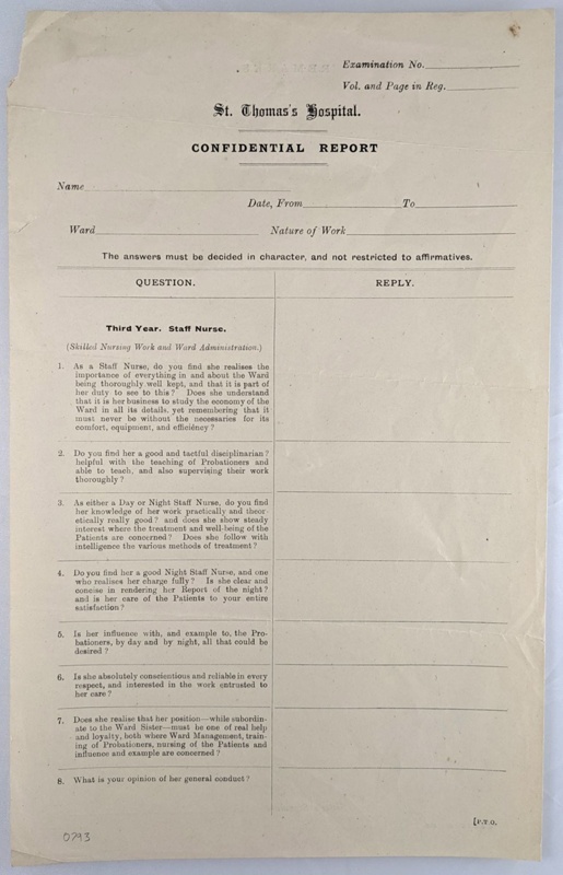 About this objectReport form. Evaluation by the ward sister of the performance of third year staff nurses at St Thomas' Hospital, [1945].