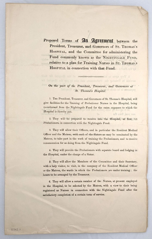 About this objectProposed terms of An Agreement between the President, Treasurer, and Governors of St. Thomas's Hospital, and the Committee for administering the Nightingale Fund, relative to a plan for Training Nurses in St. Thomas's Hospital in connection with that fund.