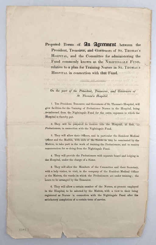 About this objectProposed terms of An Agreement between the President, Treasurer, and Governors of St. Thomas's Hospital, and the Committee for administering the Nightingale Fund, relative to a plan for Training Nurses in St. Thomas's Hospital in connection with that fund.