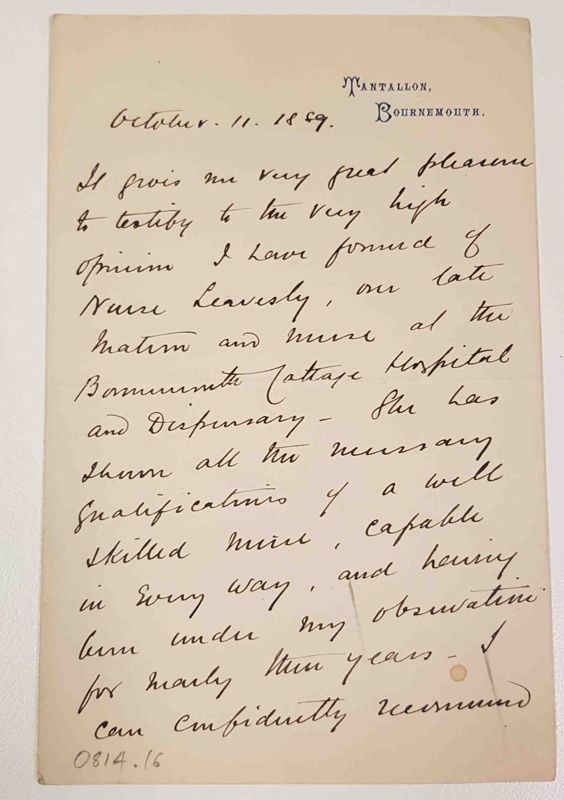 About this objectTestimonial for Nurse Leavesley by Justyn G.D. Douglas MD Senior Surgeon at the Royal Victoria Hospital, Bournemouth. Letter contains same content as item 0814.15.