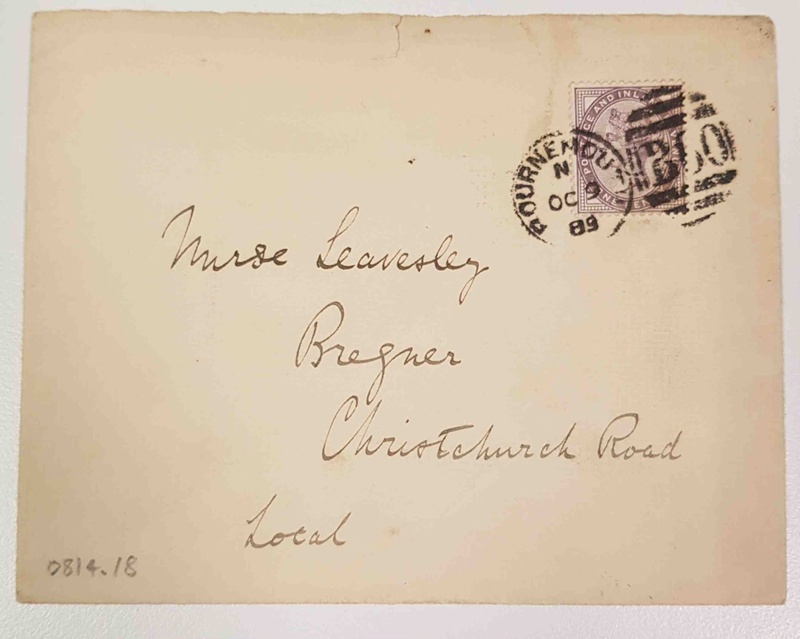 About this objectEnvelope addressed to Nurse Leavesley, B[...]gner Christchurch Road, local. One penny stamp in top right corner and two franked postmarks.