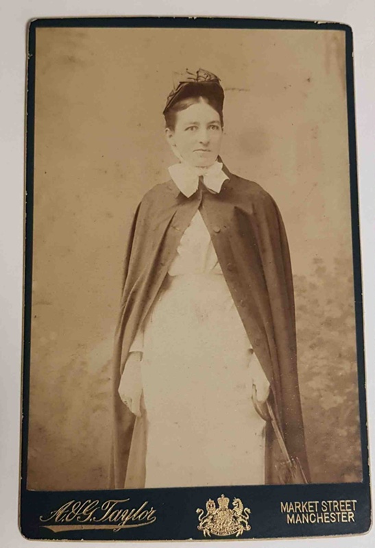 About this objectPhotograph of Miss Catherine Eliza Barff in uniform. Studio of A & G Taylor, Market Street, Manchester. Mounted on green card and gilded along edges. White sticker on reverse giving details of image.