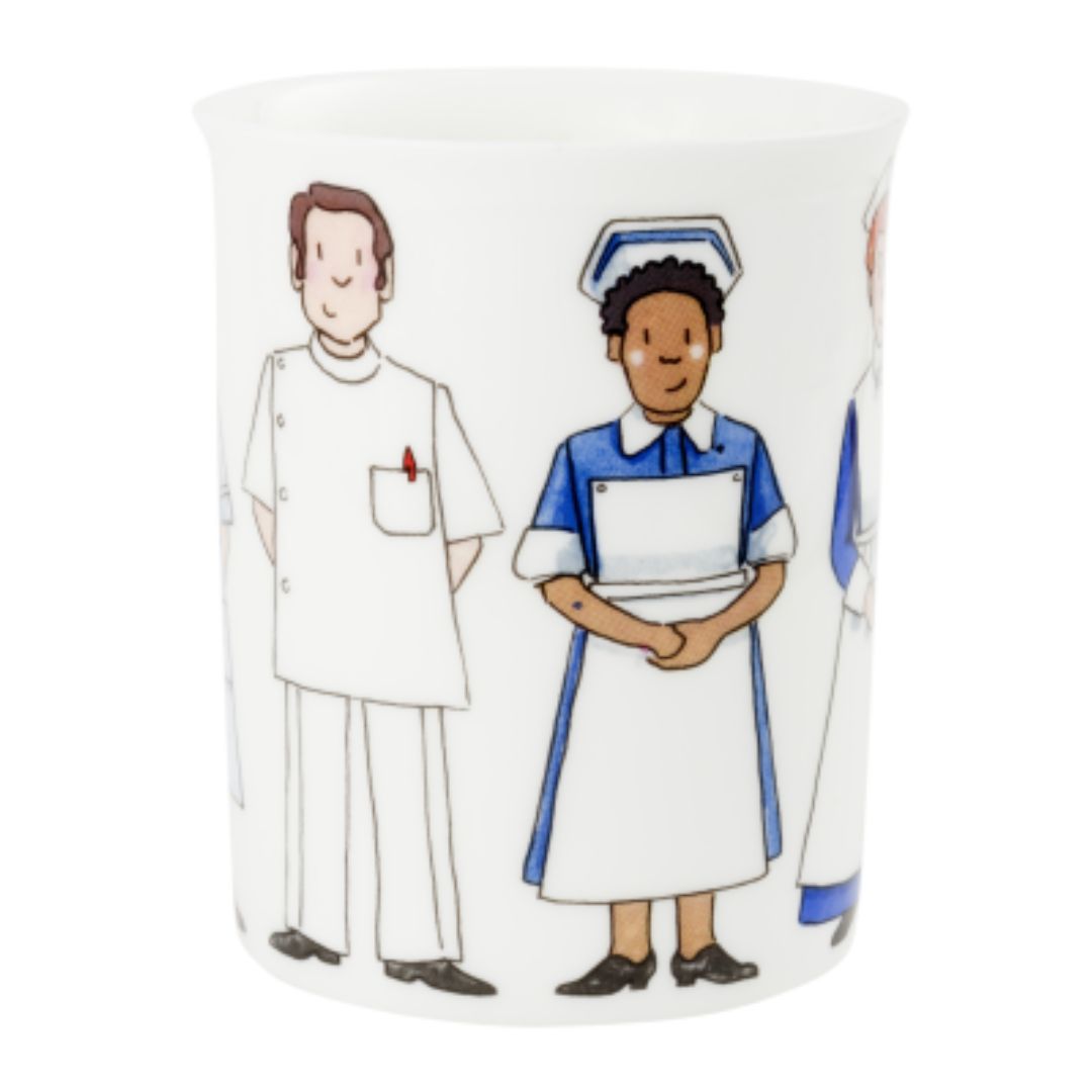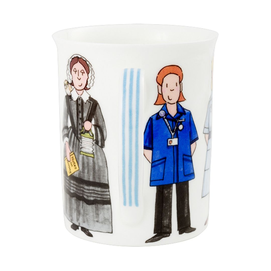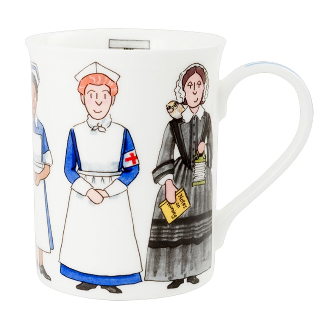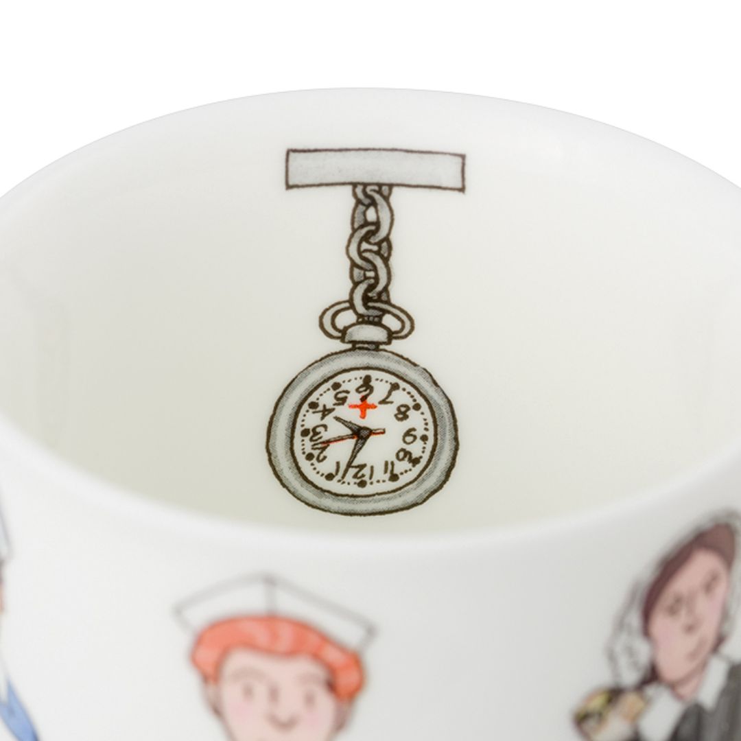 A beautiful translucent, pure white, fine bone china mug featuring images of six nurses through time, including Florence herself, and with delightful fob watch illustration detail inside the mug itself.