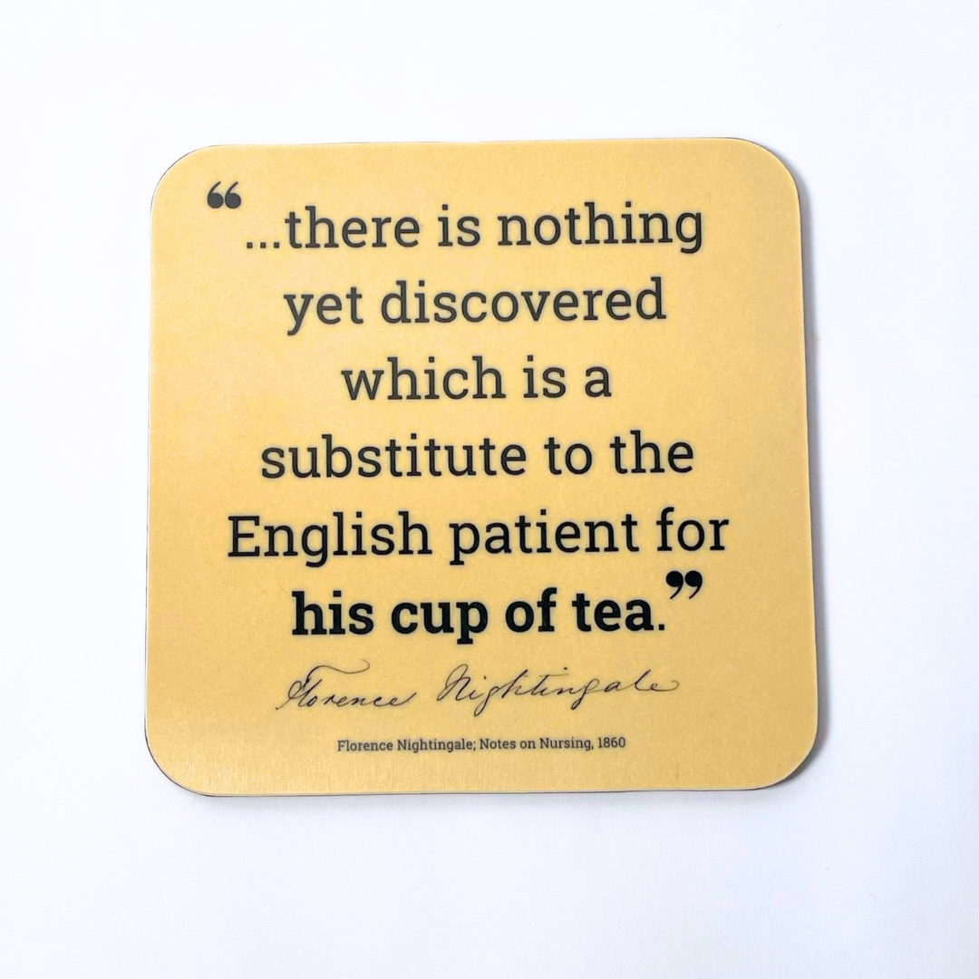A coaster with the quote “… there is nothing yet discovered which is a substitute to the English patient for his cup of tea.”